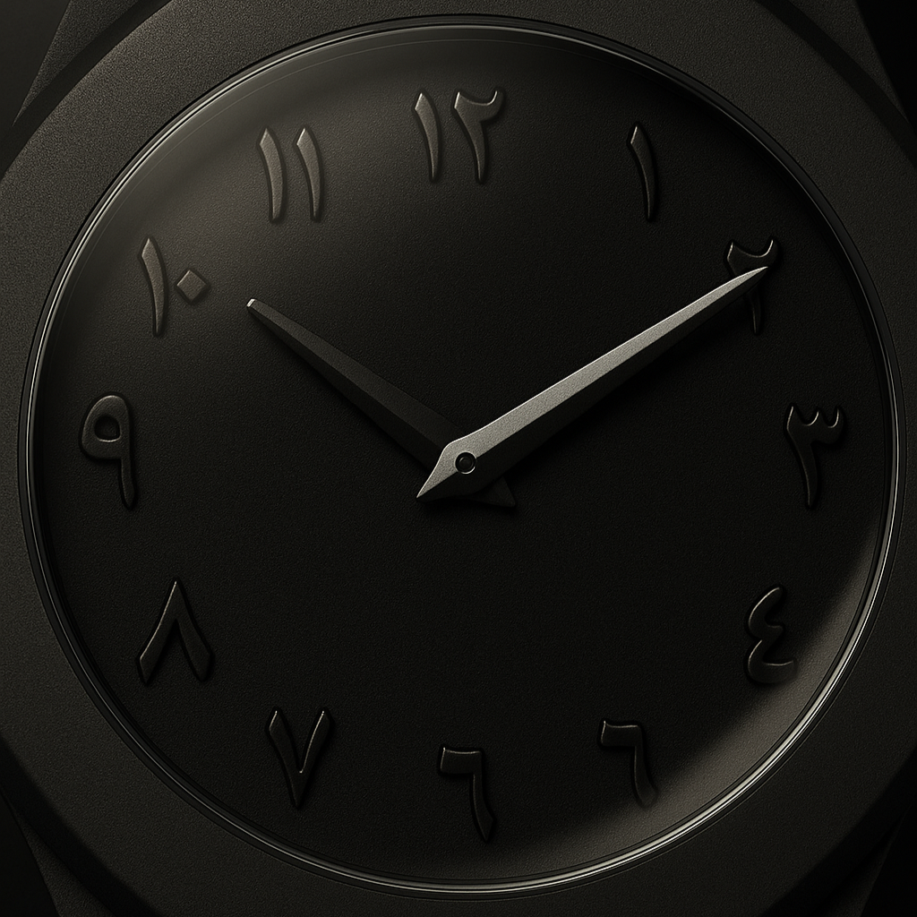 Mostrador em preto fosco com numerais orientais em relevo, criando um equilíbrio perfeito entre tradição e modernidade.